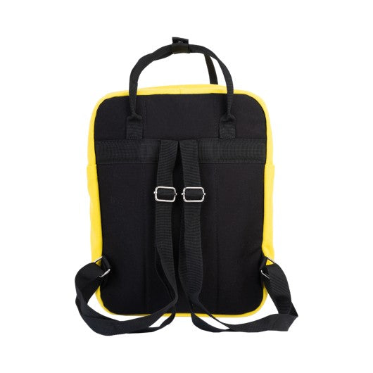 With a zipped front pocket and two side pockets; there is another large pocket on the inside. With wide, ergonomic shoulder straps and top carry handles.