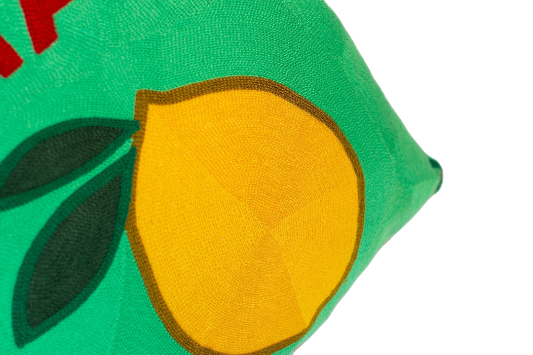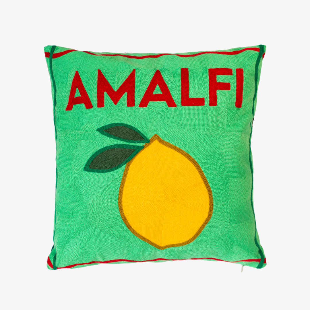 Transport yourself to the glamorous Amalfi coast with this needle-thread cushion. Featuring a statement Lemon design and a luxury green velvet back this cushion would be a great addition to any sofa. Mix and match with other cushions from the collection to make the ultimate statement.