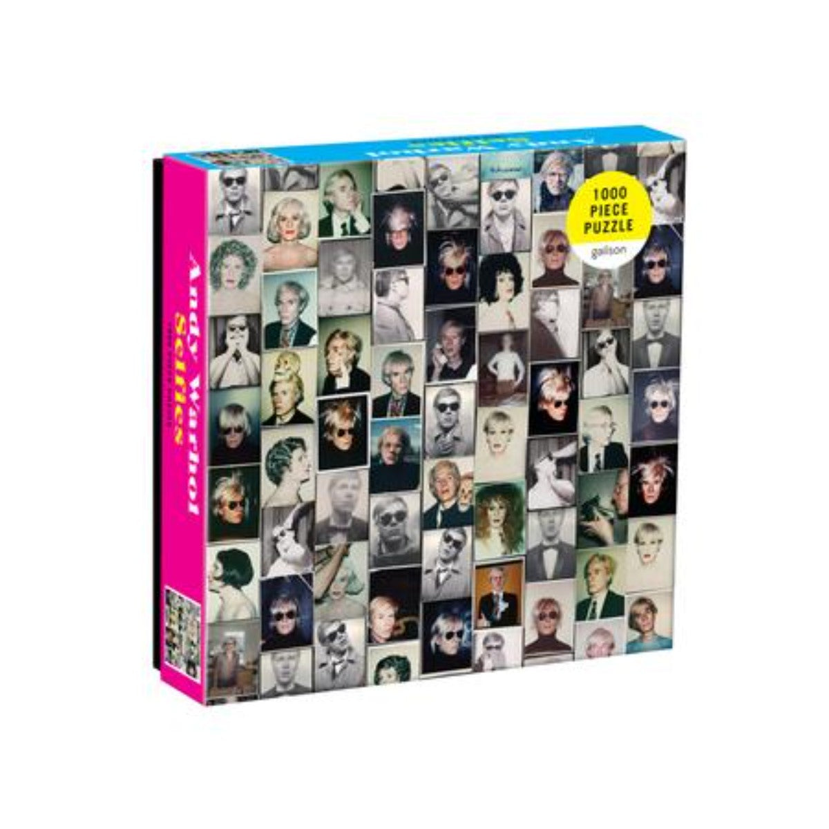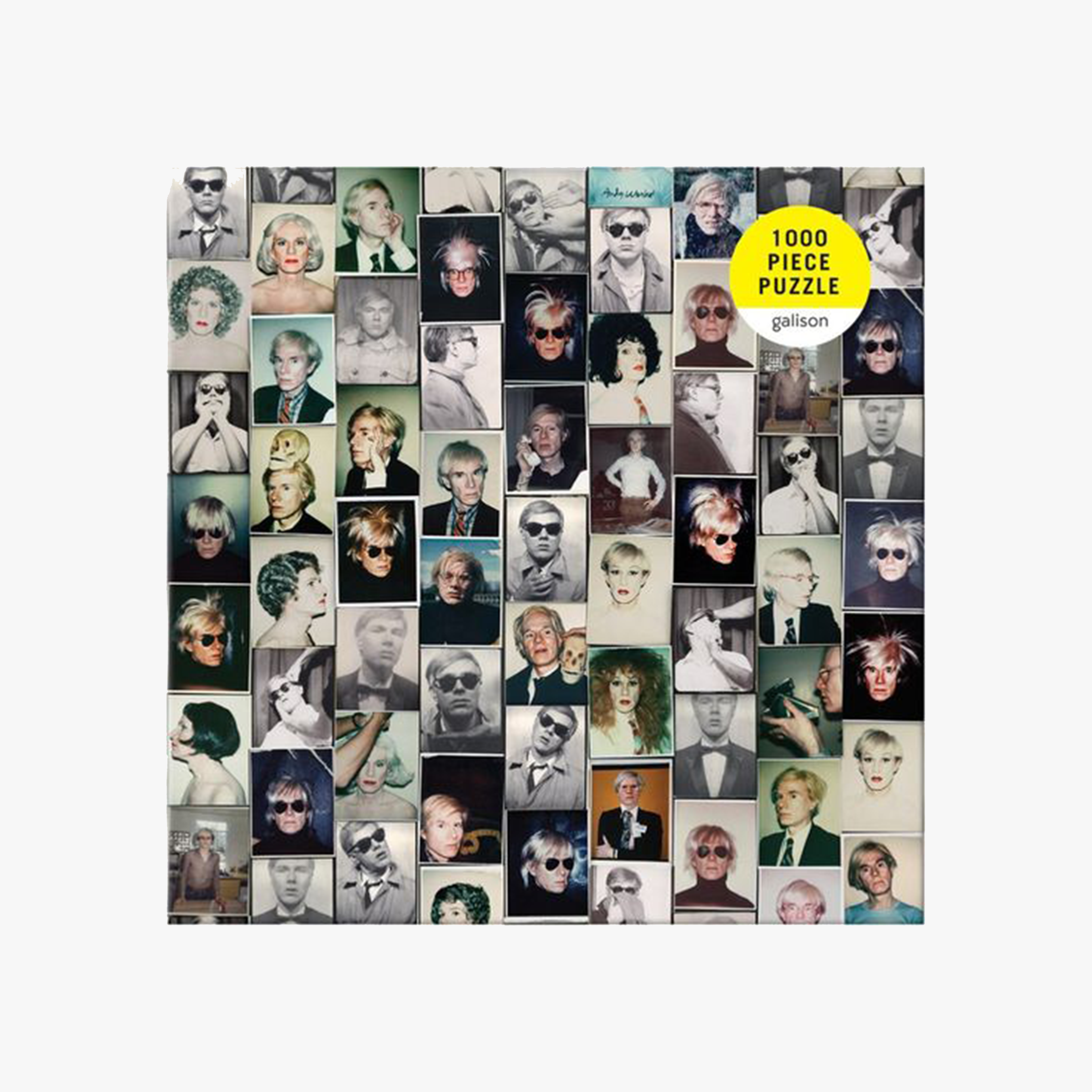 Andy Warhol Selfies 1000 Piece Puzzle features a collage of the artist’s famous self-portrait Polaroid photographs.