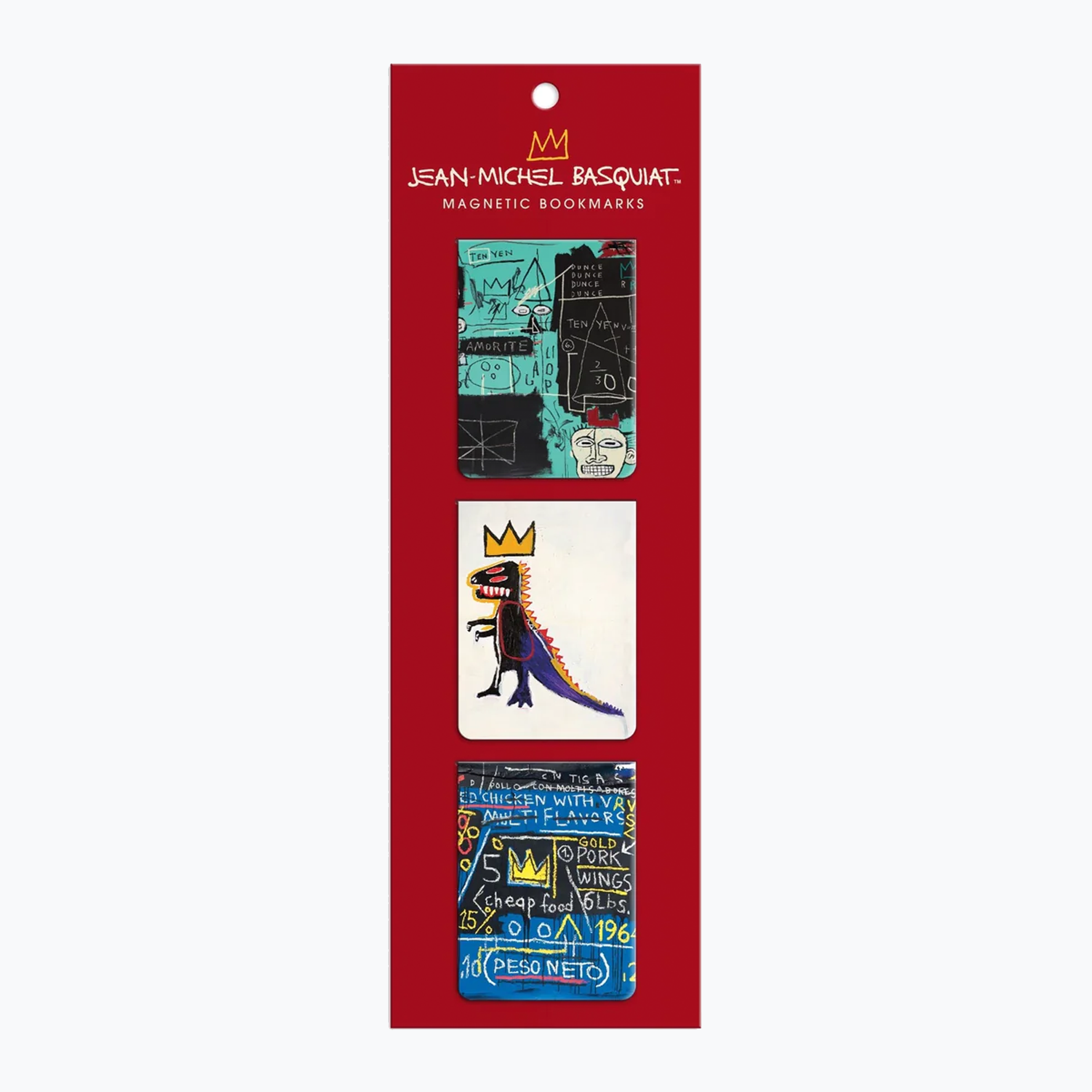 Basquiat Magnetic Bookmarks showcase Basquiat's key iconography. Basquiat was fascinated with graphic symbols and created his visual lexicon crown, the dinosaur and dinosaur Pez dispenser, play on words and text. This 3-bookmark set is the perfect gift for readers and art lovers alike.