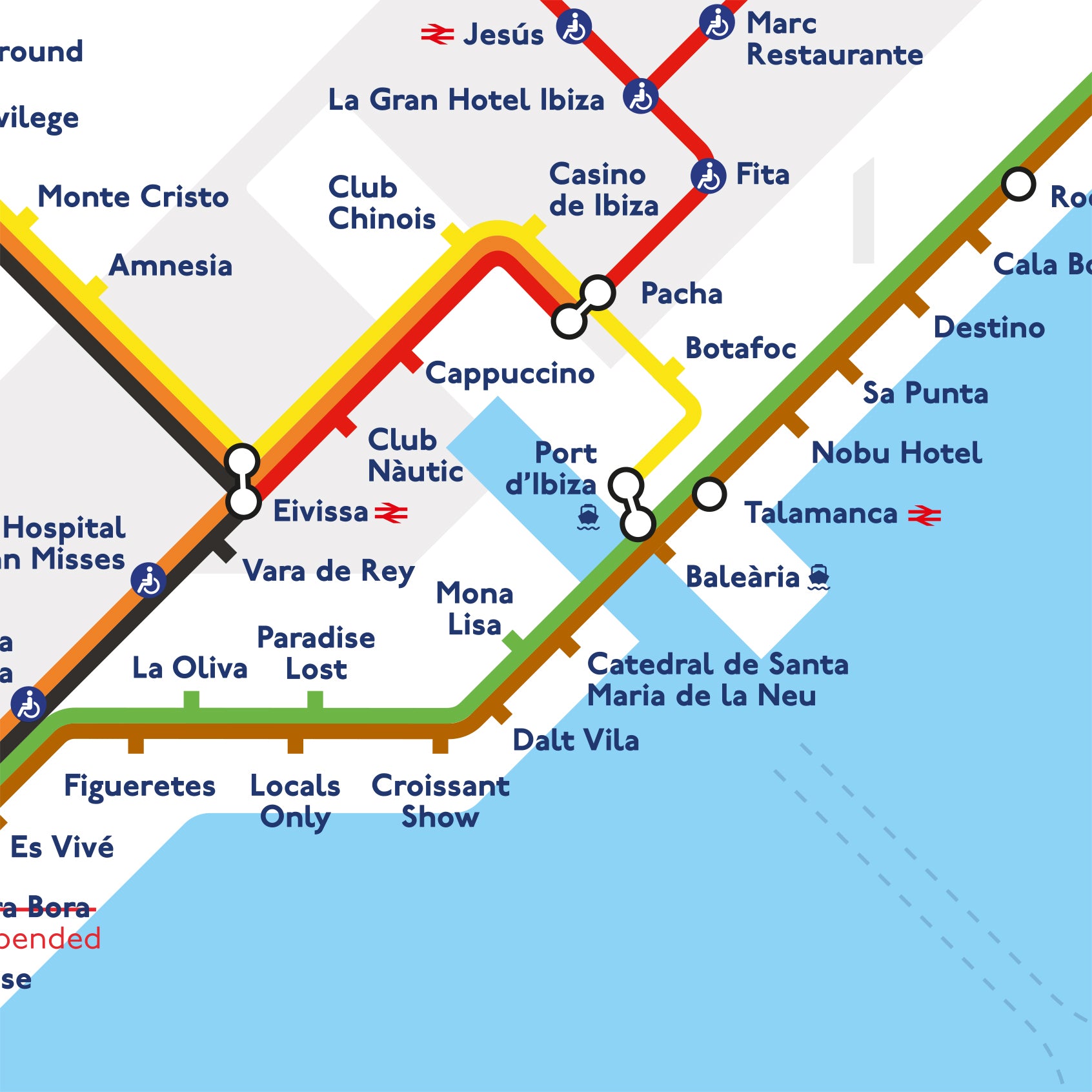Cindy Houdini is a pseudonymous artist best known for creating The Ibiza Tube Map, first released in 2024. Born and raised on the island, Houdini knows Ibiza like the back of her hand. Each edition of the map is a playful, up-to-the-minute reflection of the island’s evolving landscape, charting current venues, closures, and iconic nightclubs as if they were tube stops. The work is a tongue-in-cheek parody, imagining a fictional underground metro system on an island famously lacking one.